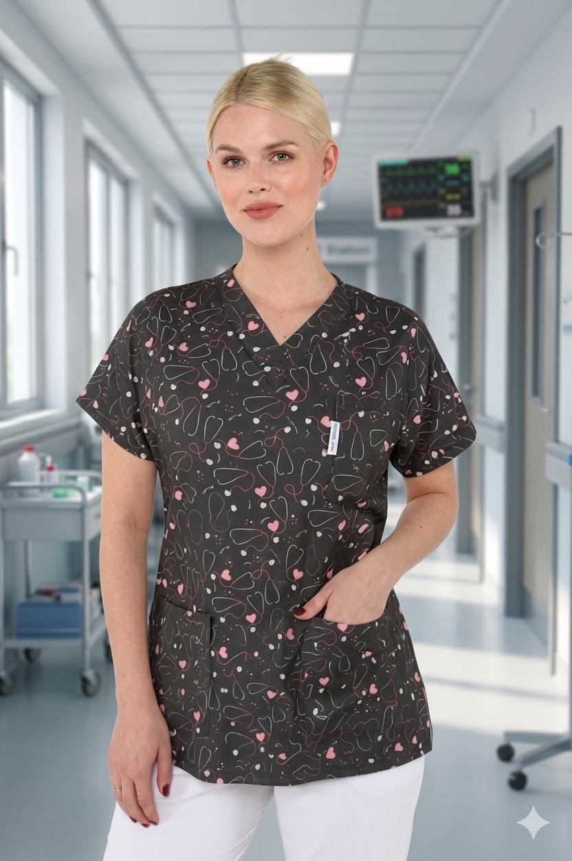 Bluză medicală imprimată din bumbac elastic – confort și stil pentru personal medical