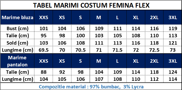 Realizat din 97% bumbac și 3% lycra (155 gr/m2), acest costum oferă echilibrul perfect între confort și flexibilitate: