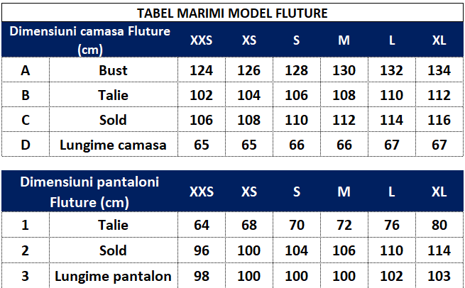 • Modelul fluture este format din 2 piese, bluza si pantalon, ambele din aceeasi tesatura si culoare si nu se comercilazieaza separat bluza de pantalon.