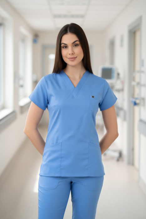 Culorile mai deschise pot arăta pete (dezinfectant, sânge) mai vizibil decât nuanțele închise. Se spală bine și revine fresh – recomandăm spălare separată/imediată după tură pentru a menține intensitatea culorii.