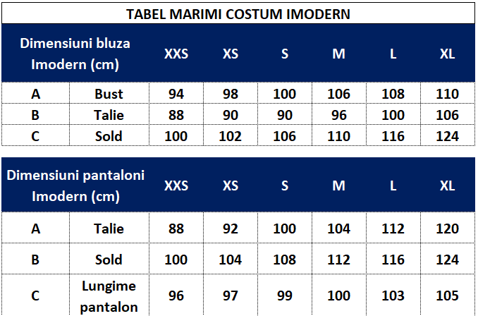 Foarte comod costumul. Marimea este buna, pantalonii trebuiesc putin modificati, sunt prea lungi pentru 1,62. As fi dorit ca bluza sa fie putin mai larguta in zona din fata, per total este ok.